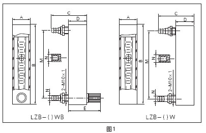 LZB-()W系列流量計(jì)不帶流量調(diào)節(jié)閥,外形及安裝尺寸見圖1和表1。