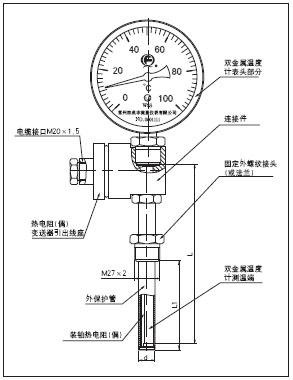 雙金屬指示熱電阻(偶)是具有現場指示和遠傳顯示功能的一體化溫度測量儀表,可用來直接測量氣體、液體 和物質的溫度。儀表可現場清晰的看到指示值,又可把信號遠傳到控制室。傳到控制室的信號有Pt100熱電阻信號, K型、E型熱電阻信號,也有經過變送為(4~20)mA標準信號,起到了一表兩用的作用。