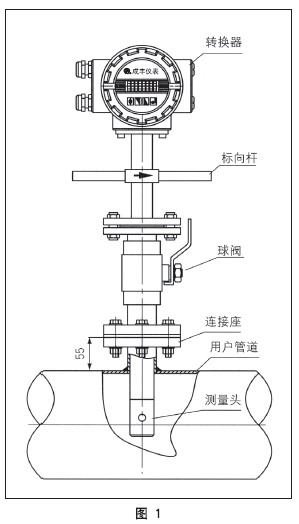 結(jié)構(gòu)組成:插入式電磁流量計(jì)由測(cè)量頭、標(biāo)向桿、插入機(jī)構(gòu)和轉(zhuǎn)換器等組成。