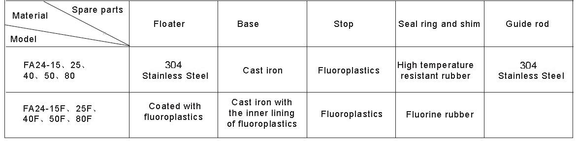 Material of flange、floater、guide rod、bearing plate and bolts are stainless steel 304(1Cr18ni9Ti ),model is of FA24-( )B.