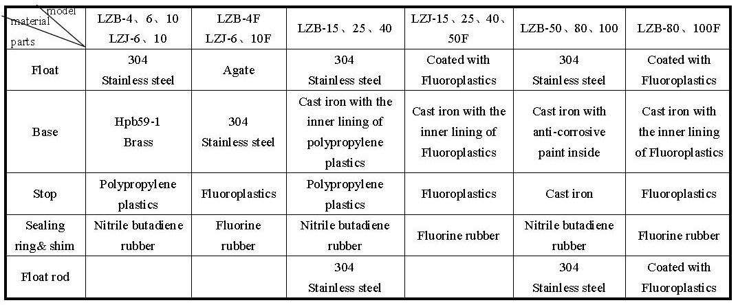 Material of flange、floater、guide rod、bearing plate and bolts are stainless steel 304(1Cr18ni9Ti ),model is of LZB-( )B.